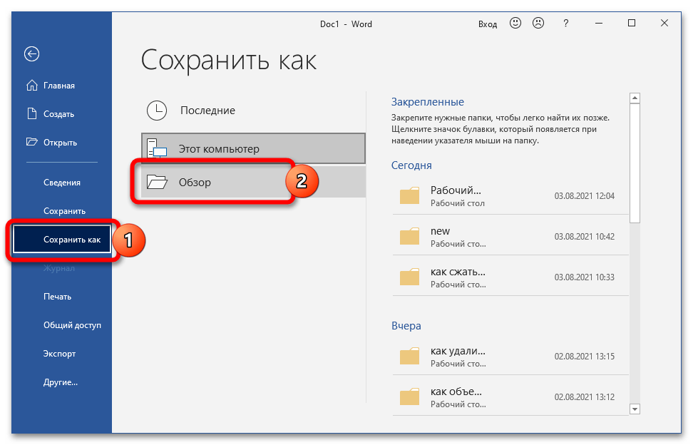 - Перейдите в меню «Файл», кликните по «Сохранить как», выберите «Обзор».