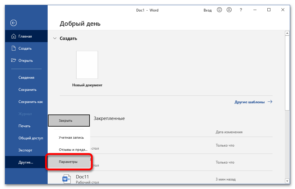 - В открытом документе перейдите во вкладку «Файл», откройте пункт «Параметры».