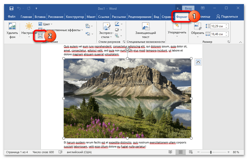 Процесс сжатия происходит панель управления документом. Для начала выберите рисунок, наведя на него курсор, и кликните по нему дважды. Далее выполните следующее: