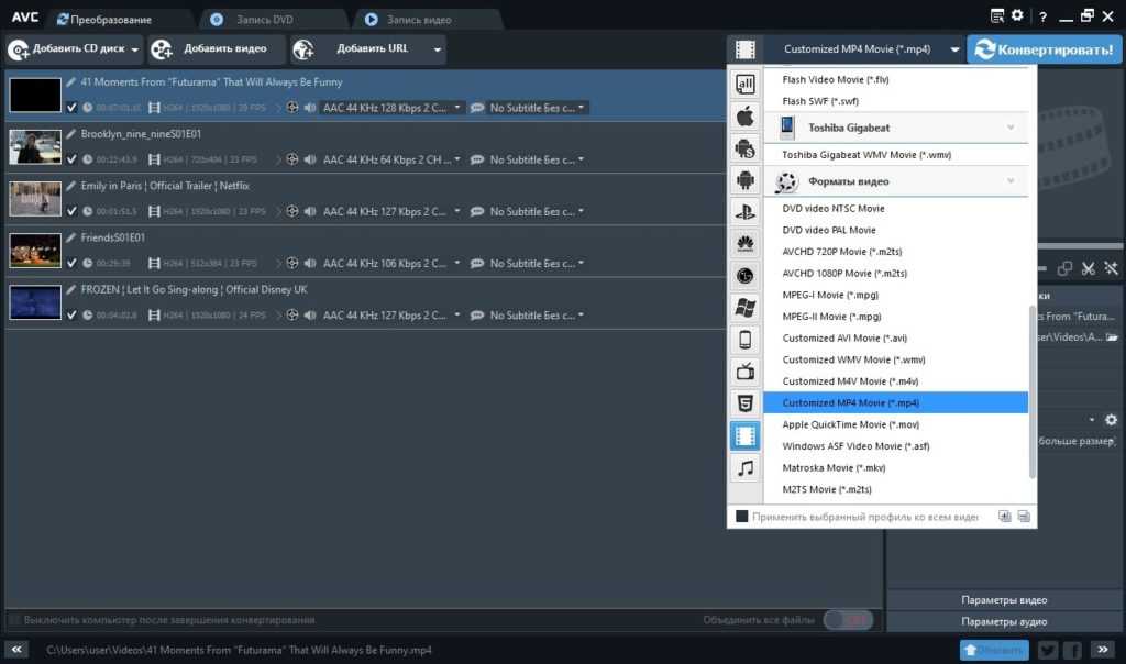 3) После, в нижней части окна программы укажите формат, в который вы хотите конвертировать видео. Наиболее распространенный — AVI, именно его и рекомендую выбрать для просмотра видео на ПК (впрочем, его поддерживают и большинство смартфонов) .