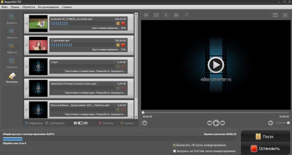 - Запустите сжатие кнопкой «Конвертировать». При необходимости процесс можно поставить на паузу, настроить автоматическое выключение компьютера и отправку файлов в YouTube.