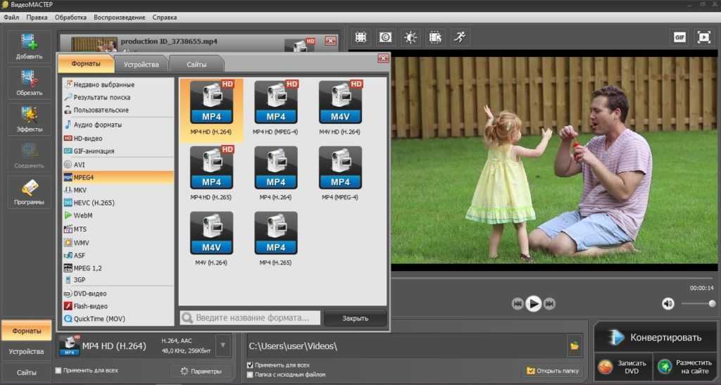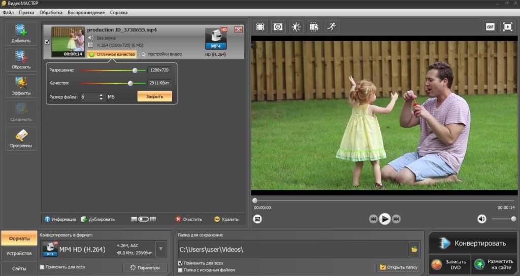 Этот русскоязычный конвертер видео поможет, если вам нужно пережать большое количество крупных файлов разных форматов с сохранением высокого качества. ВидеоМАСТЕР позволяет вручную устанавливать разрешение экрана, регулировать битрейт и выставлять желаемый вес. Имеется встроенный редактор и возможность отправлять файлы в интернет, поэтому он подойдет, в том числе, для изменения объема роликов для ютюба.