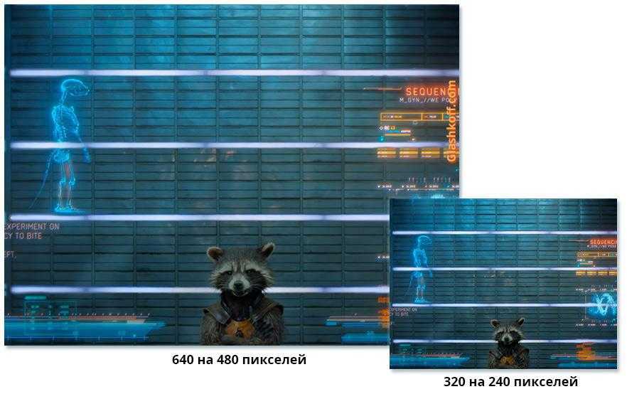 Ширина и высота кадра — важные характеристики (их еще называют разрешением). Меньше разрешение — меньше картинка, хуже качество. Вот разница между разрешением в 640 на 480 пикселей и 320 на 240: