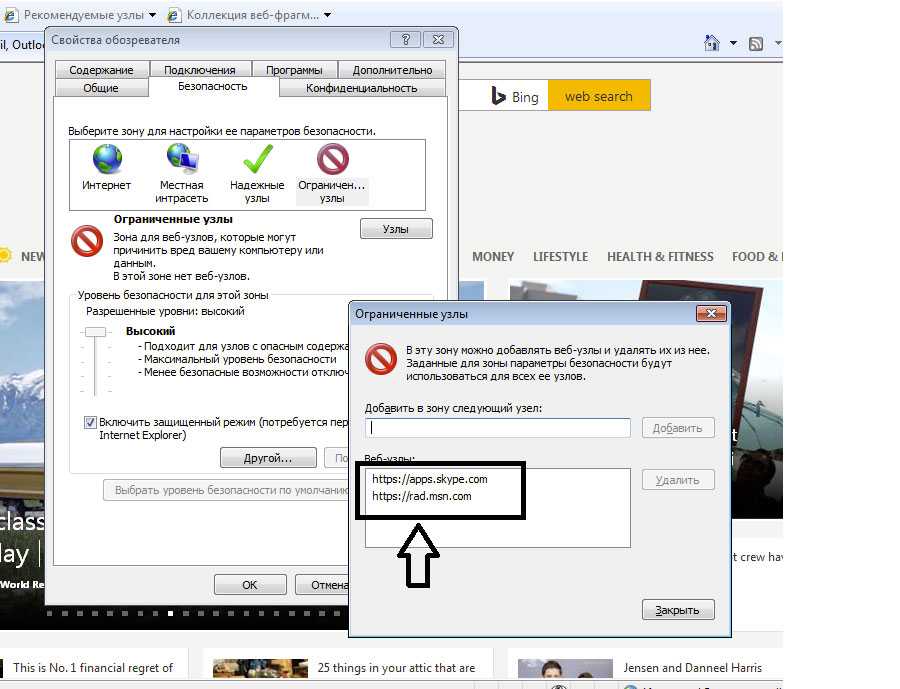 используя кнопку «Добавить», введите адреса https://rad.msn.com, https://apps.skype.com и добавьте их в список (показано на скриншоте);