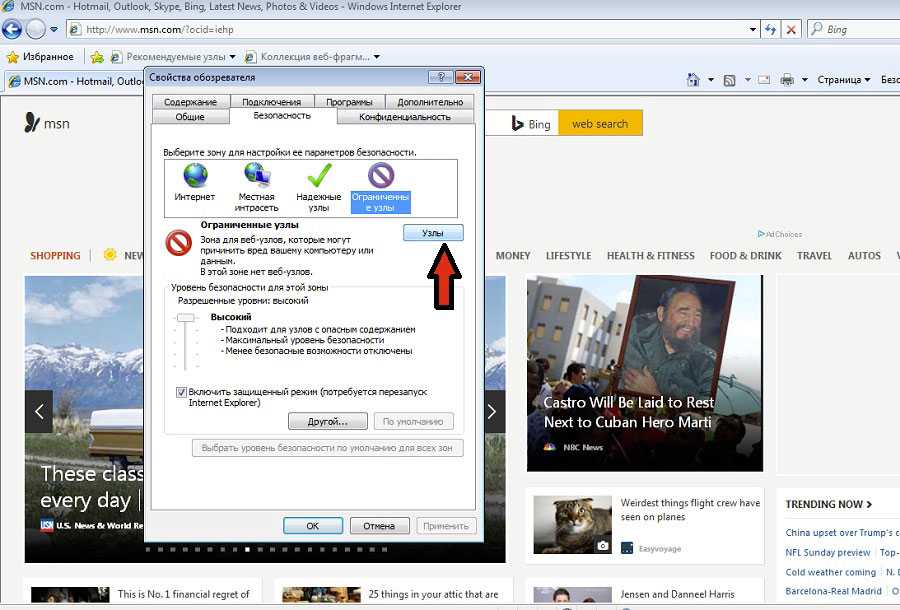 Заходим «Пуск -> Панель управления -> Свойства обозревателя», где переходим на вкладку «Безопасность» и выбираем зону настройки параметров «Ограниченные узлы»: