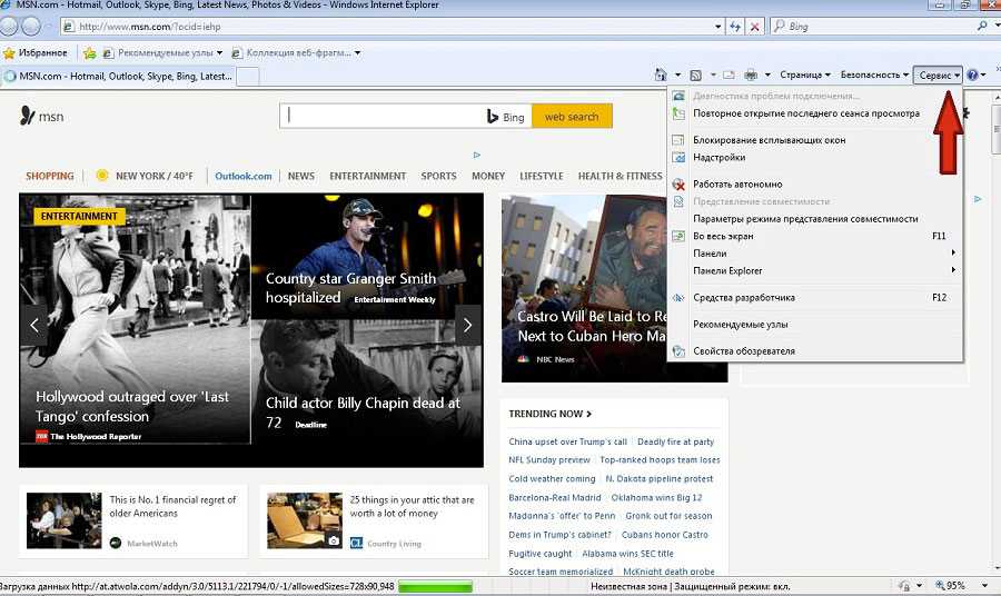 - Запустите Internet Explorer. Нажмите «Сервис» и перейдите в свойства веб-обозревателя.