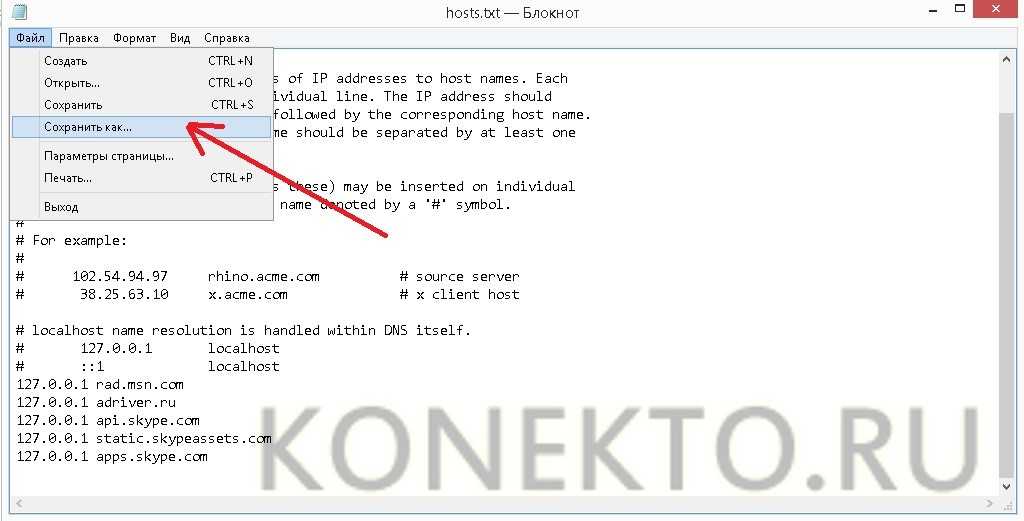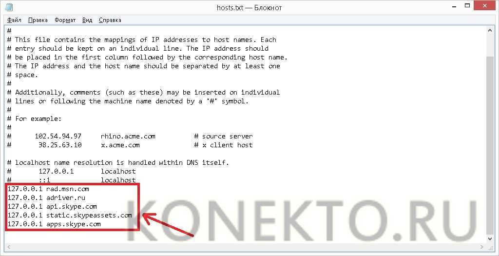 - перейдите вниз всего файла и сделайте следующие записи: 127.0.0.1 rad.msn.com, 127.0.0.1 apps.skype.com (показано на скриншоте);