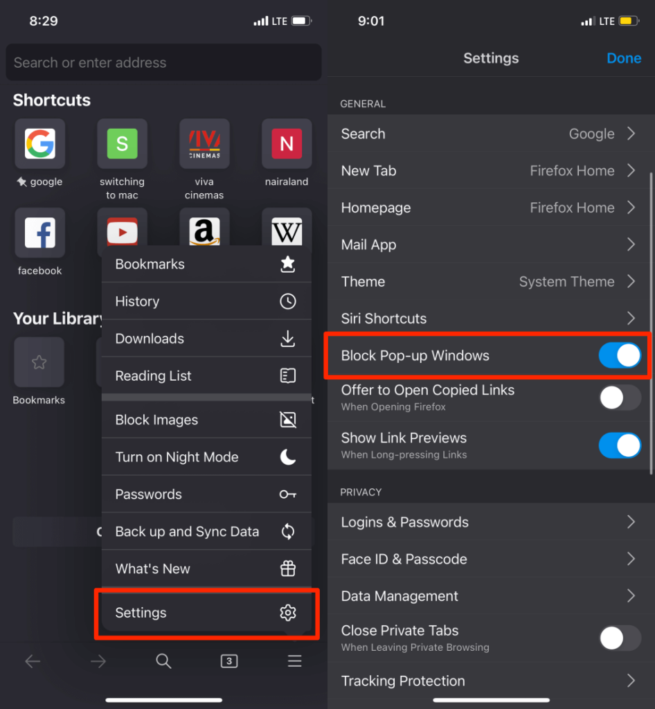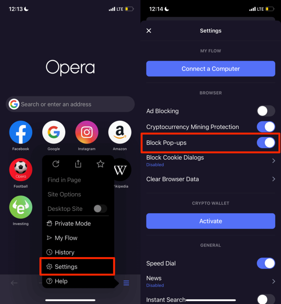 Откройте Opera, коснитесь значка меню-гамбургера в левом нижнем углу, выберите « Настройки » и включите « Блокировать всплывающие окна ».