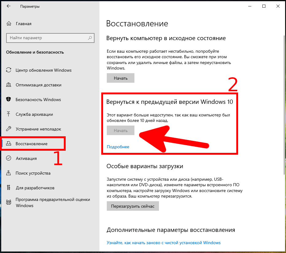 Если вы не видите раздел «Вернуться к предыдущей версии Windows 10», значит, с момента обновления до текущей сборки прошло более 10 дней, и Windows удалила эти файлы. Также возможно, что вы запустили инструмент очистки диска и выбрали файлы «Предыдущие установки Windows» для удаления. Сборки обрабатываются практически как новые версии Windows, поэтому вы удаляете сборку так же, как вы удаляете Windows 10 и возвращаетесь к Windows 8.1 или 7. Если прошло более 10 дней, то кроме переустановки Windows нет другой возможности вернуться к более старой версии.