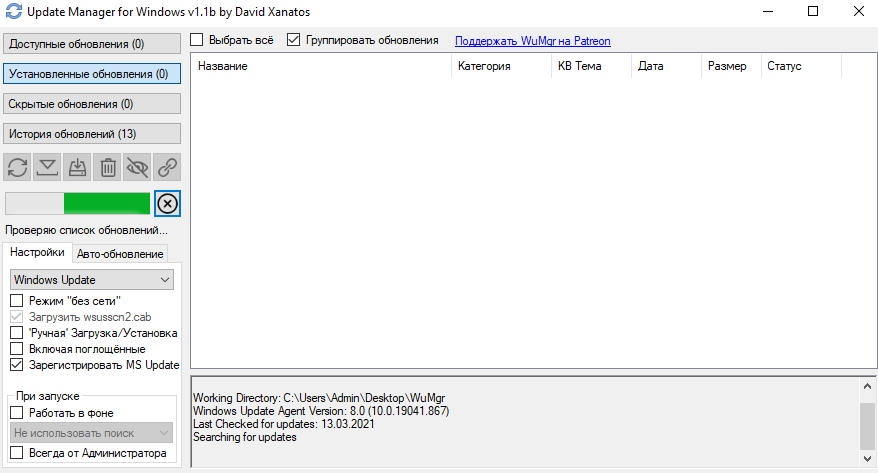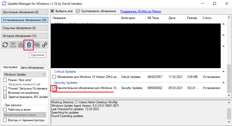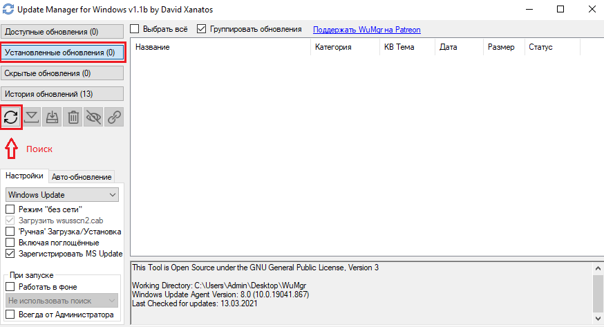 Распакуйте архив в любую папку и запустите утилиту от имени Администратора (исполняемый файл: wumgr.exe). В открывшемся окне, выберите «Установленные обновления» и нажмите на Поиск: