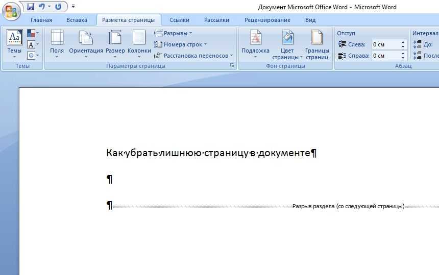 Если вы обнаружили в конце документа страницу без печатных символов, но с разрывом раздела, то удалить её можно следующим образом: перед разрывом вам нужно будет поставить ваш курсор, а затем нажать на Delete. После выполнения этих действий ваша цель будет достигнута.