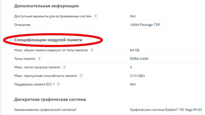 А вот так в разделе «Спецификации памяти» выглядит информация о максимальной поддержке объёма «оперативки» на официальных страничках моделей процессоров Intel .