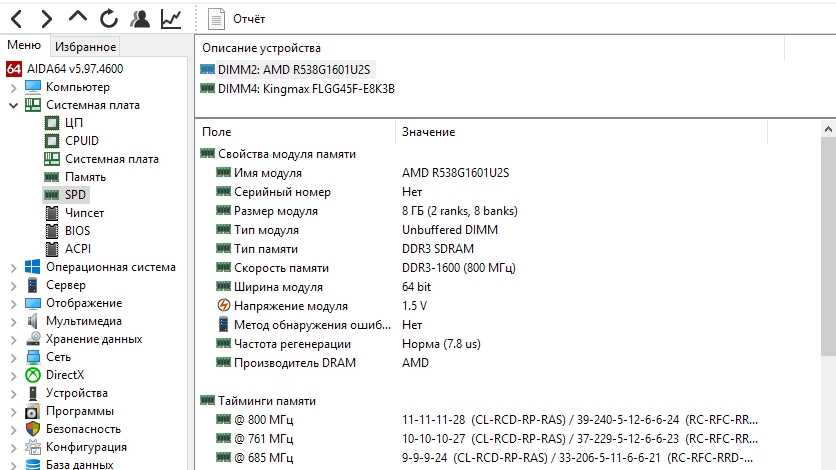 Если же перейти в раздел SPD, то можно получить конкретную информацию по каждому модулю, используемому в конкретном слоте, а также о чипе самой оперативки с маркировкой, серией и номером. К слову, именно эту информацию считывает ПК при каждой своей загрузке, выстраивая соответствующий режим работы.