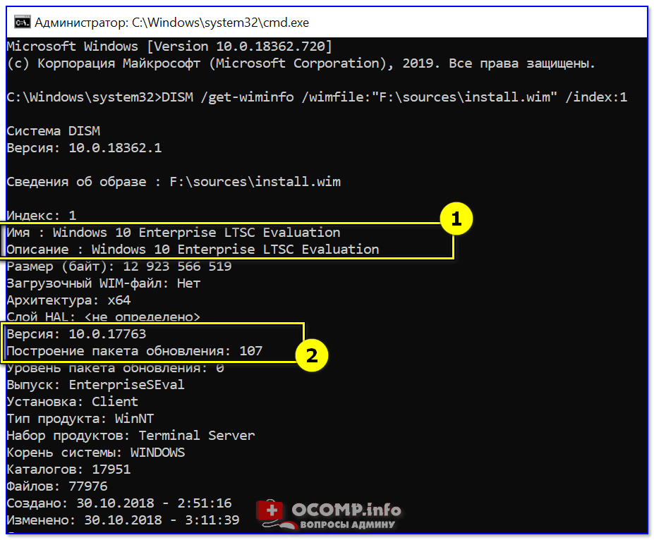 «F» – это буква смонтированного образа. Если самым большим был файл install.esd, то впишите его вместо install.wim. В случае с мультизагрузочным образом (x86 и x64) следует поочередно ввести команды вида «dism /Get-WimInfo /WimFile:F:\x86\sources\install.wim /index:1» и «dism /Get-WimInfo /WimFile:F:\x64\sources\install.wim /index:1».