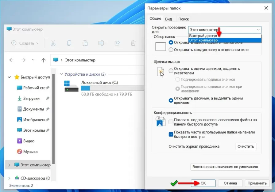 В дальнейшем каким бы способом вы ни открывали Проводник — откроется «Этот компьютер». Если необходимо вернуться к стандартному представлению Проводника — проделайте описанные выше действия и поменяйте «Этот компьютер» на «Быстрый доступ», а затем щелкните «ОК».
