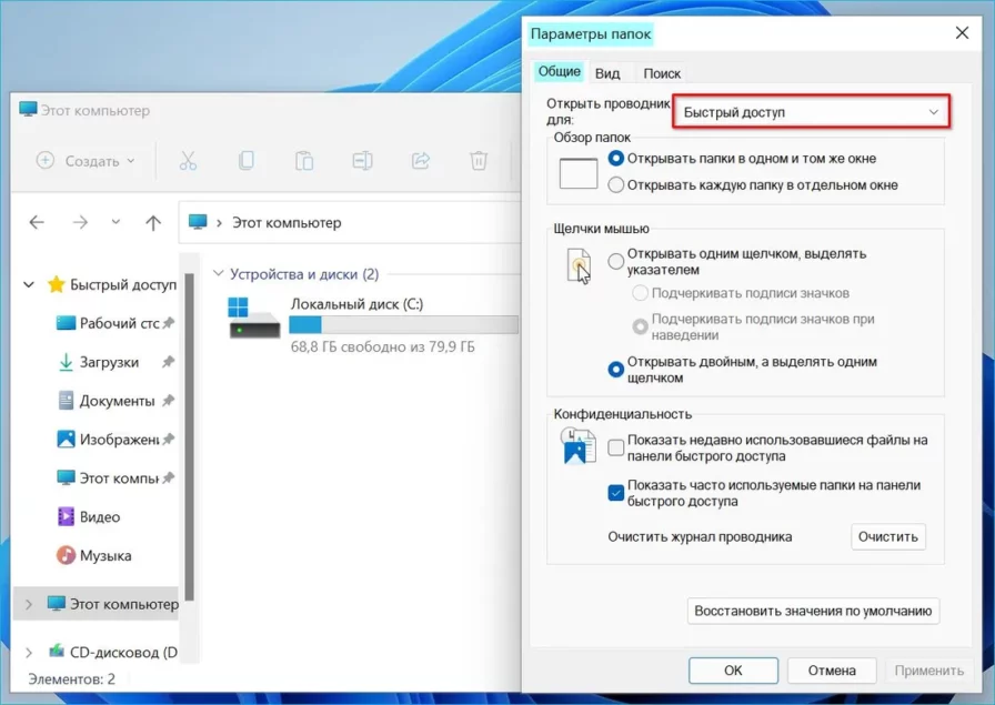 В окне «Параметры папки» перейдите на вкладку «Общие». Разверните список «Открыть проводник для:». Установленная по умолчанию опция — «Быстрый доступ».