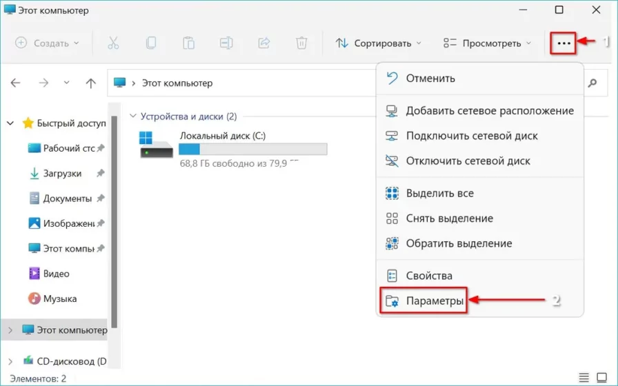Нажмите Win + E, чтобы открыть штатный файловый менеджер ОС — Проводник Windows. Щелкните по «горизонтальному троеточию» на панели инструментов утилиты.