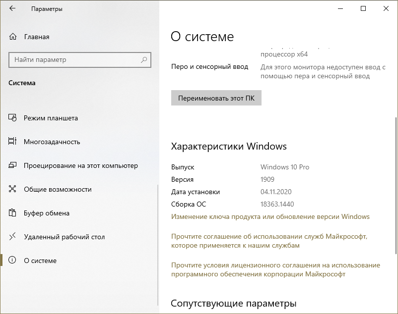 Если вы не знаете, какая у вас редакция, то просто зайдите в параметры ОС (можно открыть, одновременно зажав клавиши Win и I) в самый первый раздел. Во вкладке «О системе» можно увидеть основную информацию. Редакция указана в строке «Выпуск»: