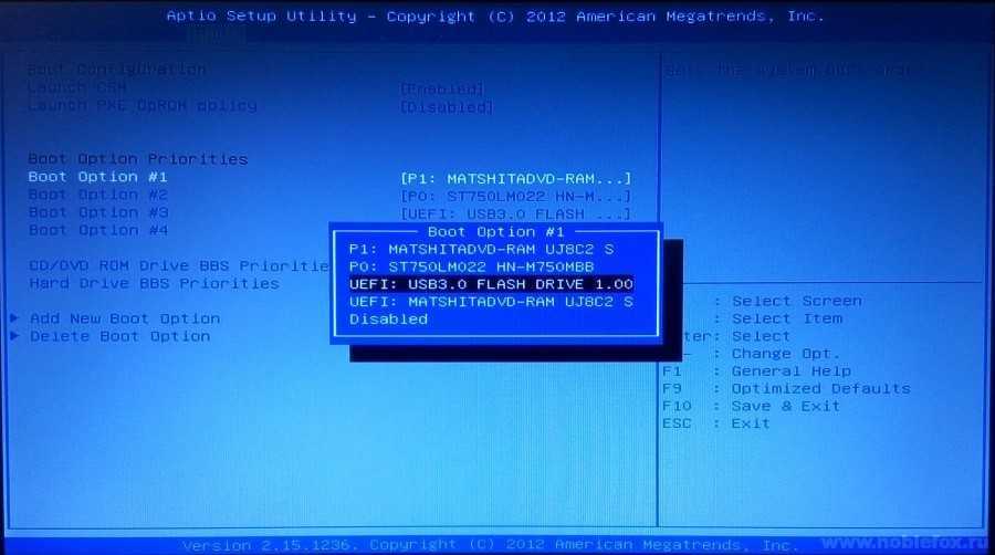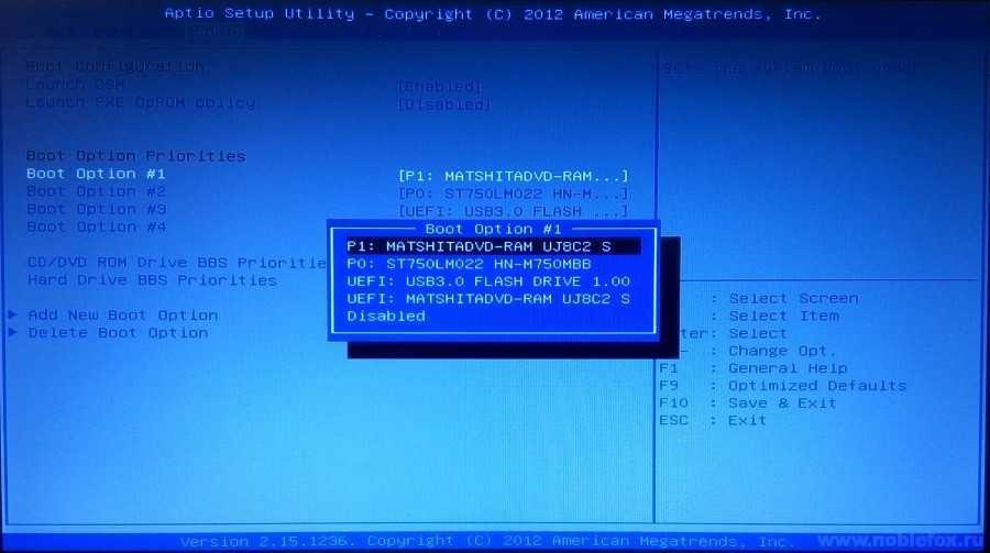 2. Перейдите на вкладку «Boot»,  Далее перешли «Boot Option 1«, нажимаем, выбираем CD-Rom.