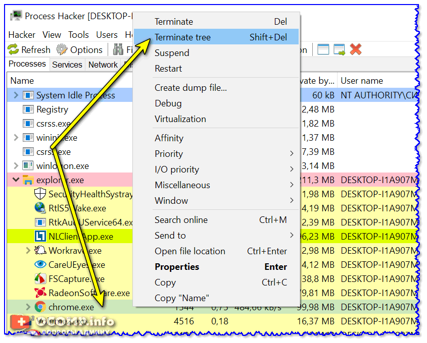 Чтобы ликвидировать (закрыть) в нем любую из запущенных программ — нужно просто ее выбрать в списке, затем нажать ПКМ по ее имени и в появившемся окне выбрать «Terminate tree» (см. пример ниже ).