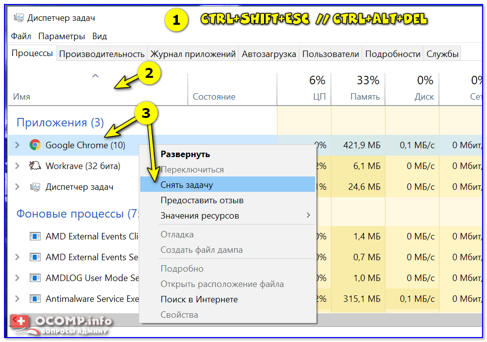 Нажмите сочетание клавиш Ctrl+Shift+Esc (или Ctrl+Alt+Del) для вызова диспетчер задач. Далее во вкладке процессы найдите зависшую программу (процесс), кликните по ней правой кнопкой мыши и в появившемся выберите «Снять задачу» . Через 3-5 сек. программа должна быть закрыта.