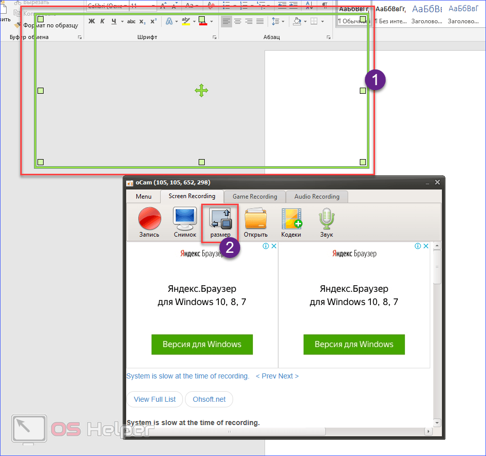 - После инсталляции рекордер запустится автоматически. Вы можете вручную поменять размер захватываемой области (1) или выбрать предустановку во вкладке «Размер» (2).