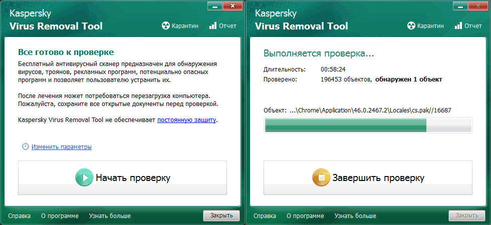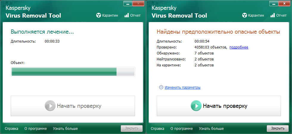 В случае обнаружения активного заражения, приложение предложит два варианта действий: