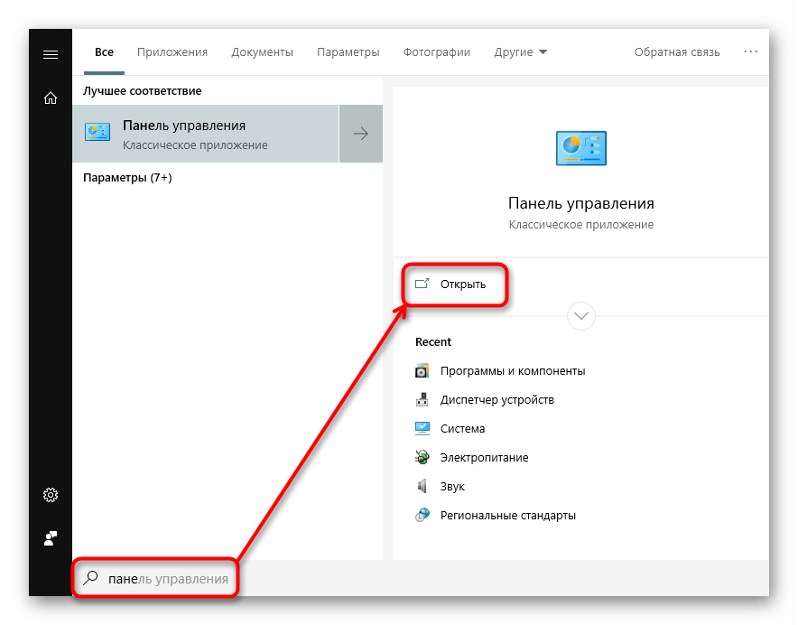 - Разверните панель управления, найдя её при помощи системной поисковой строки.