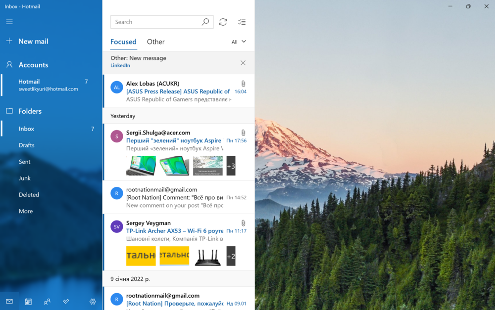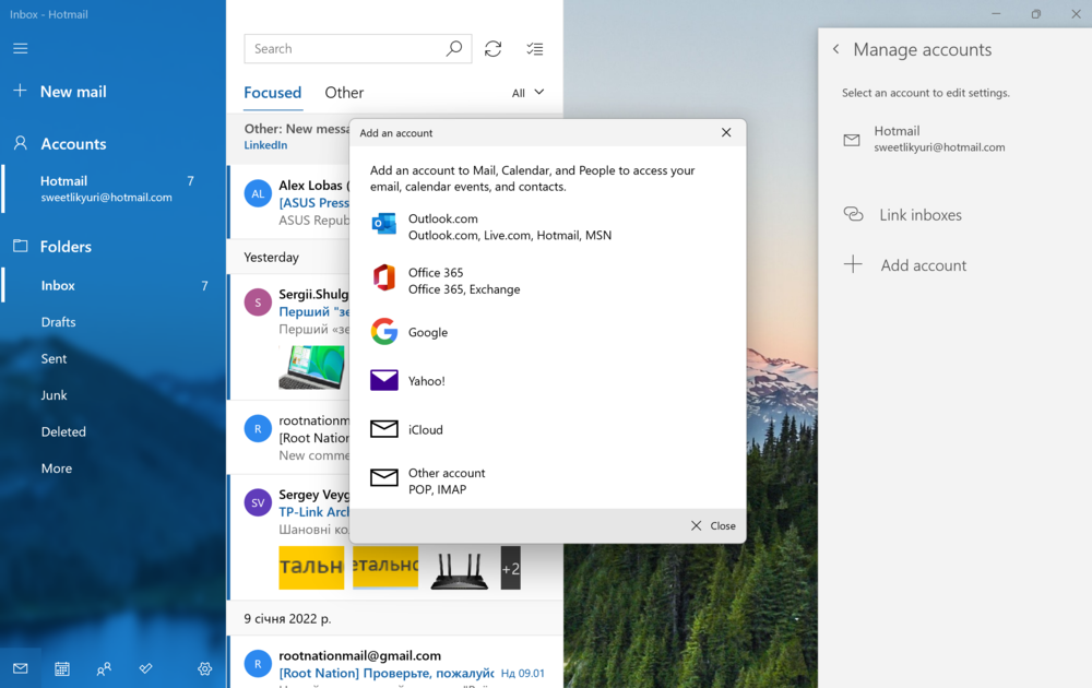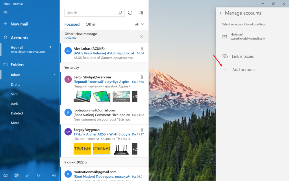 Нажимаете Добавить учетную запись и вводите нужный электронный адрес и пароль к нему. Через минуту и новая учетная запись будет доступна в почтовом приложении Windows 11. Каких-либо ограничений по количеству учетных записей нет.