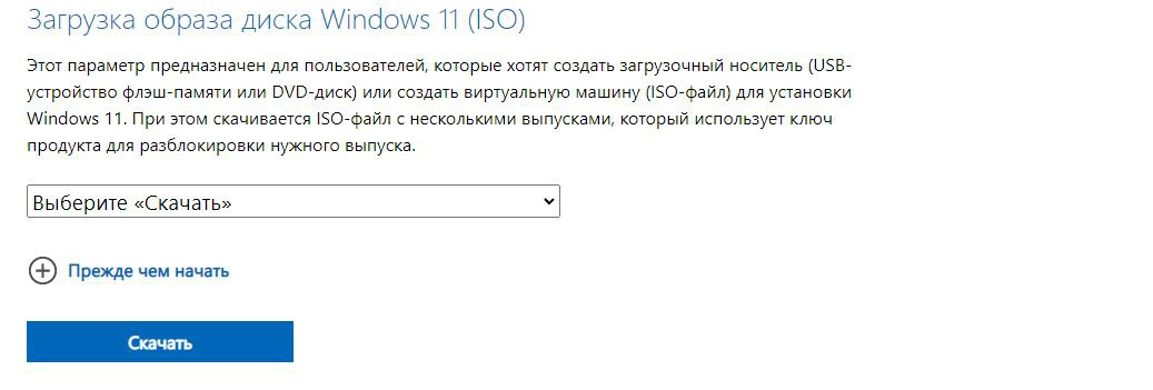 Если вам необходимо скачать ISO-файл (предположим, для установки Виндовс на удаленный компьютер), то найдите “Загрузка образа диска Windows 11 (ISO)” и нажмите “Скачать”.
