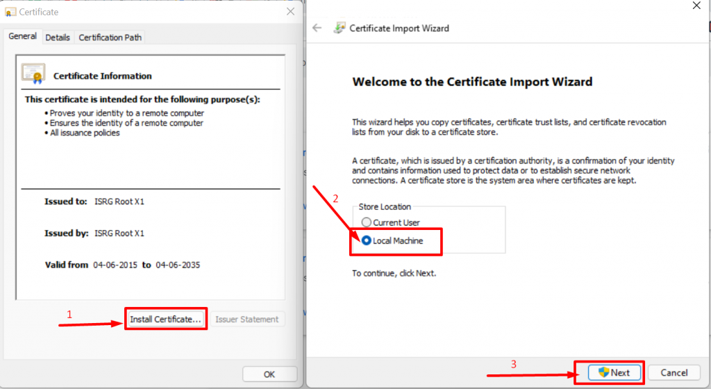 Step 6: Click on the Install Certificate as shown in the above picture followed by choosing Local Machine > Next.