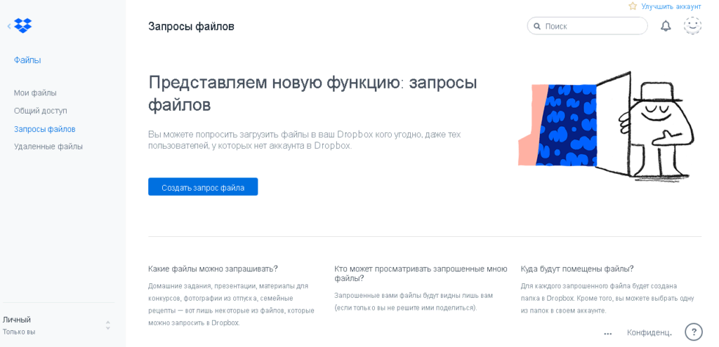 Третьим блоком в списке является Запросы файлов — это новая функция, представленная Dropbox. Она предоставляет пользователю возможность загрузки данных через других людей, которые могут как иметь аккаунт в данном хранилище, так и не иметь его. Внесение документов происходит с помощью запроса файла у другого пользователя.