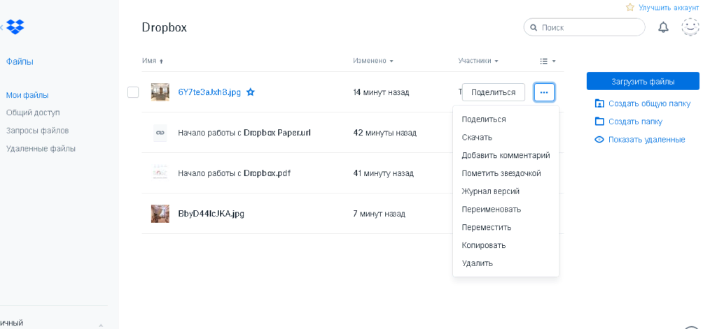 Здесь слева находятся основные инструменты управления аккаунтом. Во вкладке Файлы отображаются все папки Dropbox, которые находятся на компьютере.