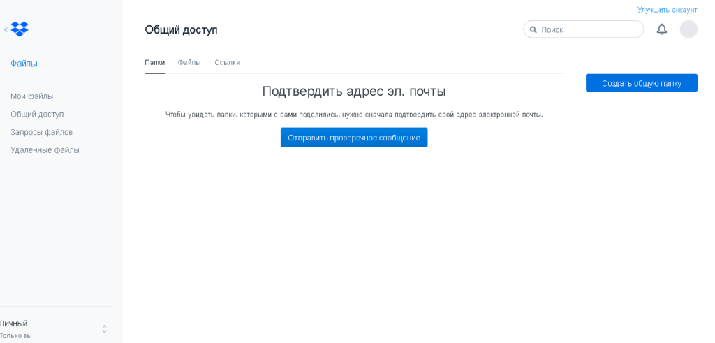 Следующий блок Общий доступ предназначен для отображения данных, которыми поделились с пользователем. Для получения файлов, необходимо подтвердить адрес электронной почты с помощью кнопки Отправить проверочное сообщение.