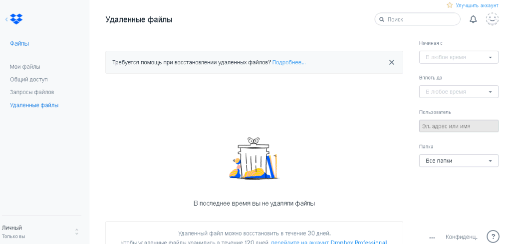 Последний раздел Удаленные файлы предоставляет возможность работы с уже удаленными данными. Так, поле справа поможет пользователю найти документы за определенные дату. Кроме этого, файлы из корзины можно восстановить в течение 30 дней.