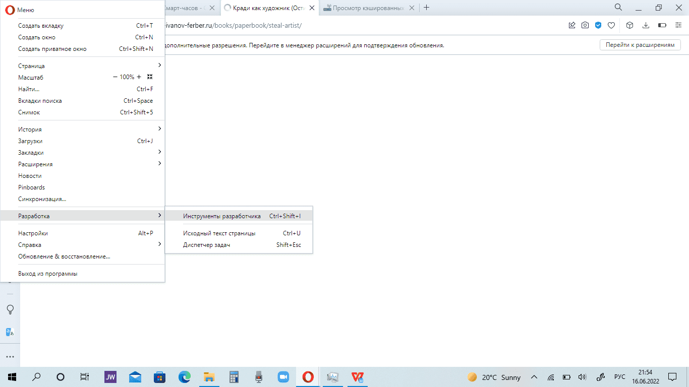 - копирование кода страницы через “Инструменты разработчика” в меню “Разработка” (в браузерах на базе Google Chrome — в меню “Дополнительные инструменты”).