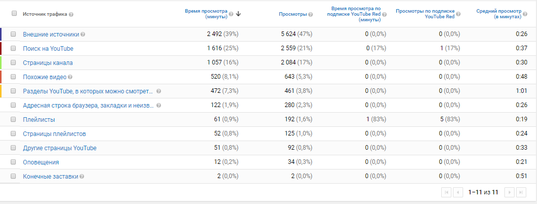 В отличии от других социальных сетей, у YouTube очень подробная статистика источников перехода. Встроенная аналитика на YouTube показывает качество трафика из разных источников: сколько времени просмотра приносят переходы и какая средняя длительность просмотра.