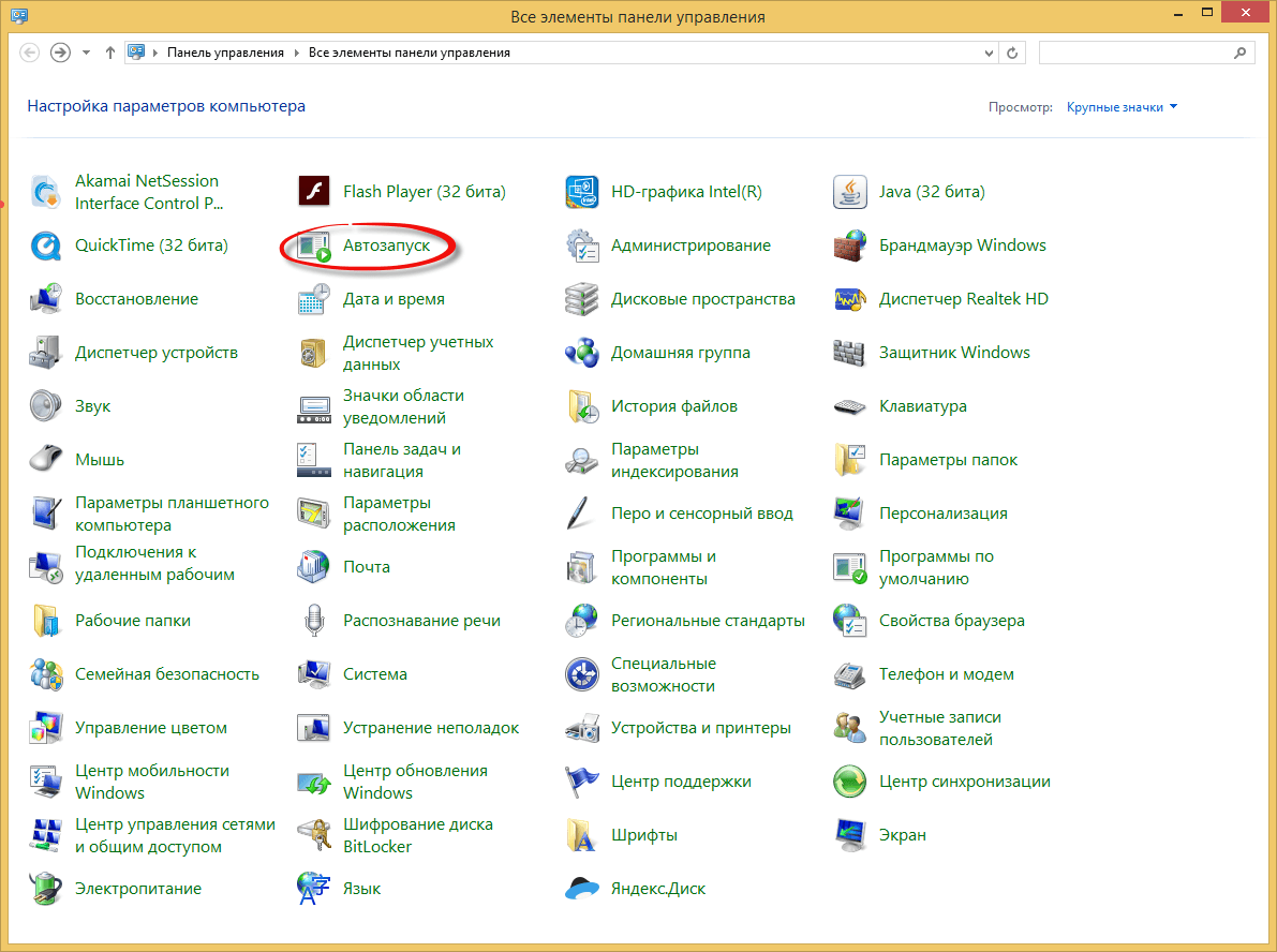 В открывшемся окне, ищем значок с надписью Автозапуск, он и отвечает за включение и выключение