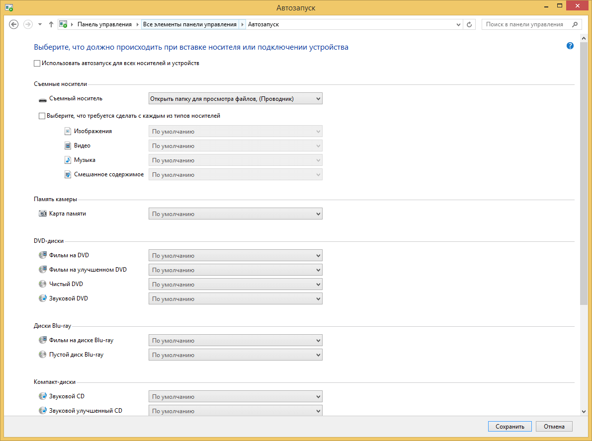 Если вы хотите выборочно оставить автозапуск, то для этого будет нужно выбрать значения для каждого пункта отдельно. В этом случае флажок напротив пункта «Использовать автозапуск для всех носителей и устройств» снимать не нужно.