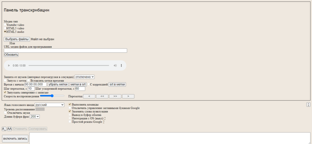 После нажатия на кнопку «Включить запись» начнется воспроизведение файла, и система переведет речь в текст.