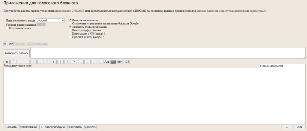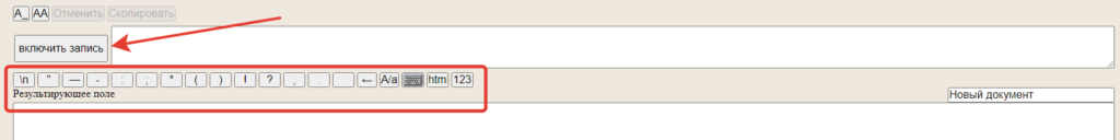 Затем надиктуйте текст. Сначала распознанные слова появятся в поле справа от кнопки «Включить запись». После небольшой паузы они попадут в поле ниже – «Результирующее поле». Над результирующим полем имеются кнопки со знаками пунктуации. По ходу голосового ввода текста вы можете добавлять их вручную.