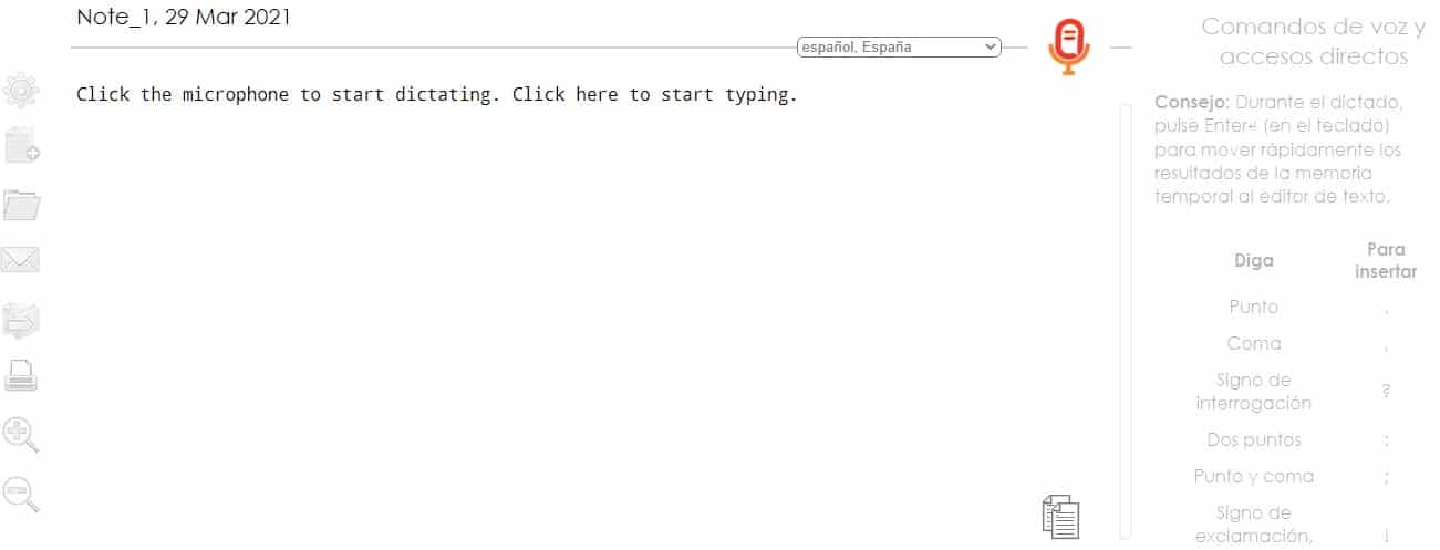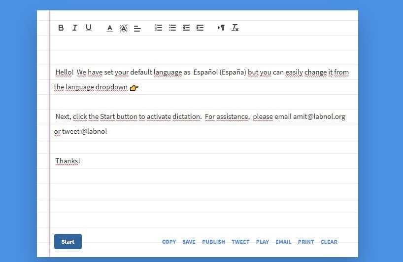 Заканчиваем выделение веб-инструмент, который дает вам возможность использовать транскрипцию аудио в текст на компьютере. Диктовка Вы можете использовать его в любом браузере, невнятно, просто нажмите кнопку «Пуск», предоставьте необходимые разрешения для доступа к микрофону компьютера и начните свою речь, заметку или все, что вы хотите сказать, вы увидите перед собой, как это становится текст, и он будет отображаться на чистом листе, когда вы говорите.