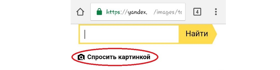 На главной странице мобильной версии Яндекса (когда запрос еще не введен), под полем для ввода слов есть надпись «Спросить картинкой».