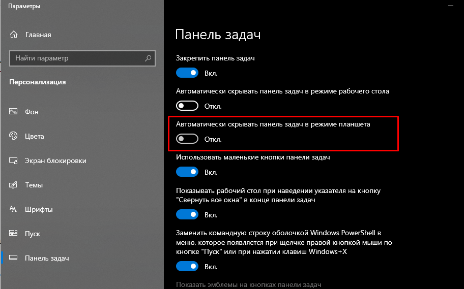 Таким методом удастся спрятать элемент интерфейса, как на Рабочем столе, так и в режиме планшета. Чтобы вернуть ПЗ на свое место, нужно повторить операцию, но при этом деактивировать обозначенный выше ползунок.
