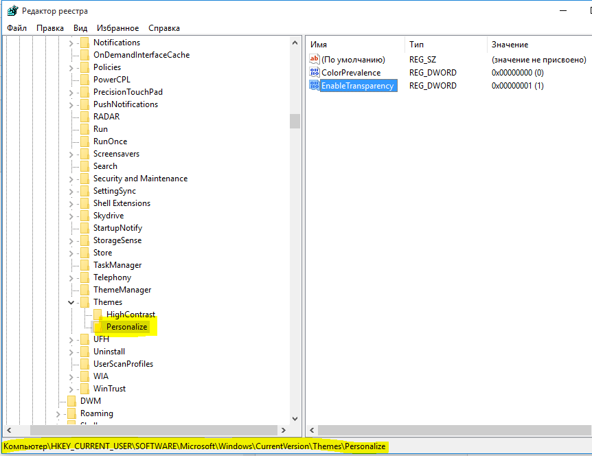 - С помощью левой панели совершите навигацию по реестровым каталогам: HKEY_CURRENT_USER -> Software -> Microsoft -> Windows -> CurrentVersion -> Themes -> Personalize.