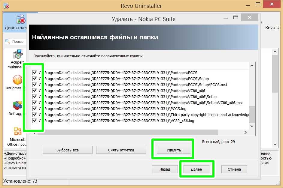 7. После такого сканирования опять жмите в появившемся окне кнопку «Далее» и перед вами откроется окно с найденными следами программы, где вам необходимо вручную отметить предлагаемые программой пункты.