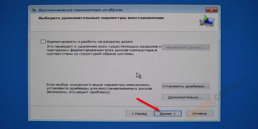 В следующем окне есть вариант форматировать весь жесткий диск и заново разбить его на разделы. Но это удалит все данные с жесткого диска. Скорее всего вам нужно просто нажать «Далее». Будут перезаписаны только те разделы, которые находятся в резервной копии. Другие разделы затронуты не будут.