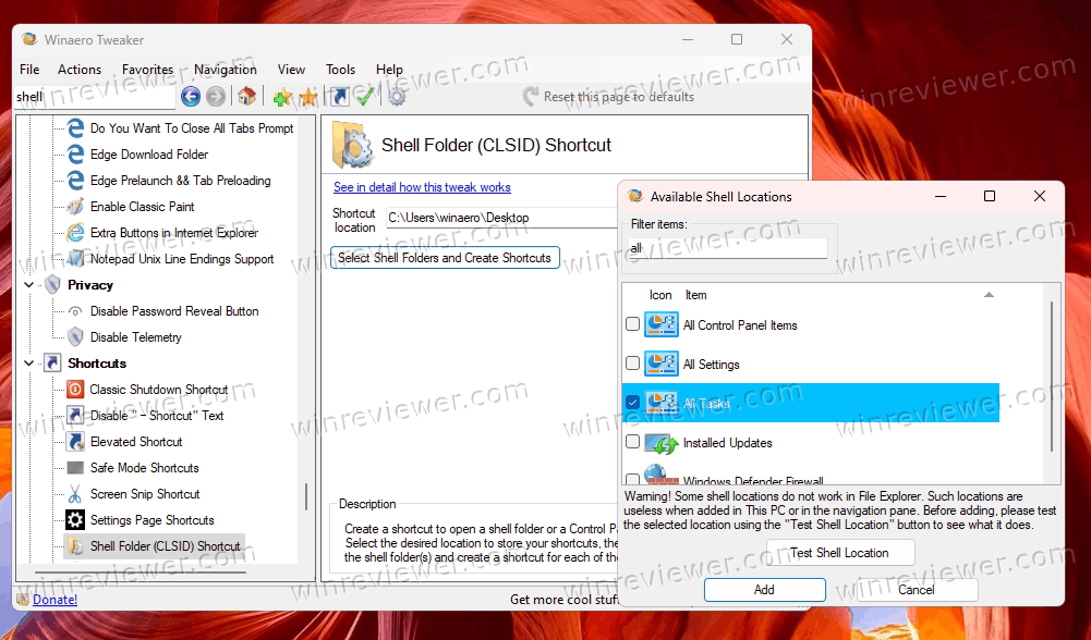 Но с помощью бесплатного приложения Winaero Tweaker вы найдете их все. Он позволяет протестировать любую из системных папок, доступных в вашей версии Windows, и создать для них ярлык на рабочем столе. Для этого , запустите его и выберите Shortcuts > Shell folders слева. Справа выберите папки или объекты, для которых вы хотите создать ярлыки, и нажмите «Создать ярлык».