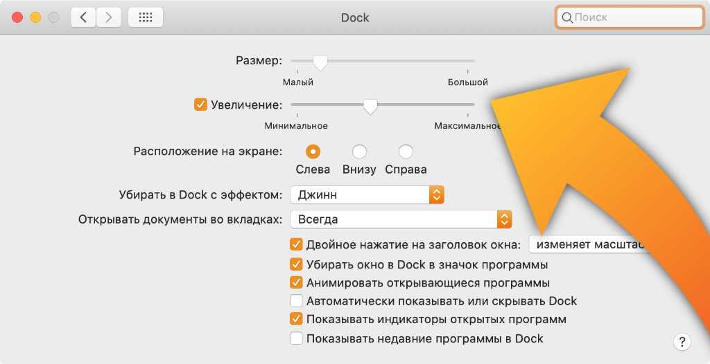 Как это сделать: откройте меню «Системные настойки» > Dock, переведите в активное положение переключатель «Увеличение» и переместите ползунок в необходимое положение.