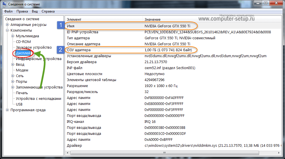 Для того чтобы увидеть параметры и характеристики видеокарты которая установлена на компьютере, нужно перейти во вкладку «Компоненты» и выбрать пункт «Дисплей», здесь для нас важная информация: Имя адаптера и ОЗУ адаптера (сколько памяти на борту у видеокарты)